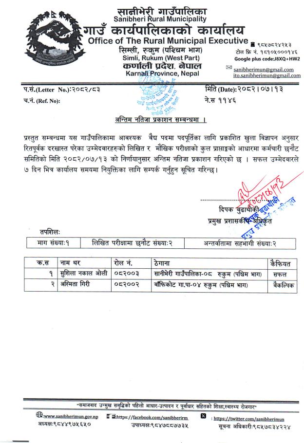 अन्तिम नतिजा प्रकाशन सम्बन्धमा । ।